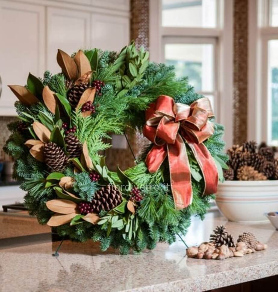 Coroncina natalizia con abete, bacche e decori.